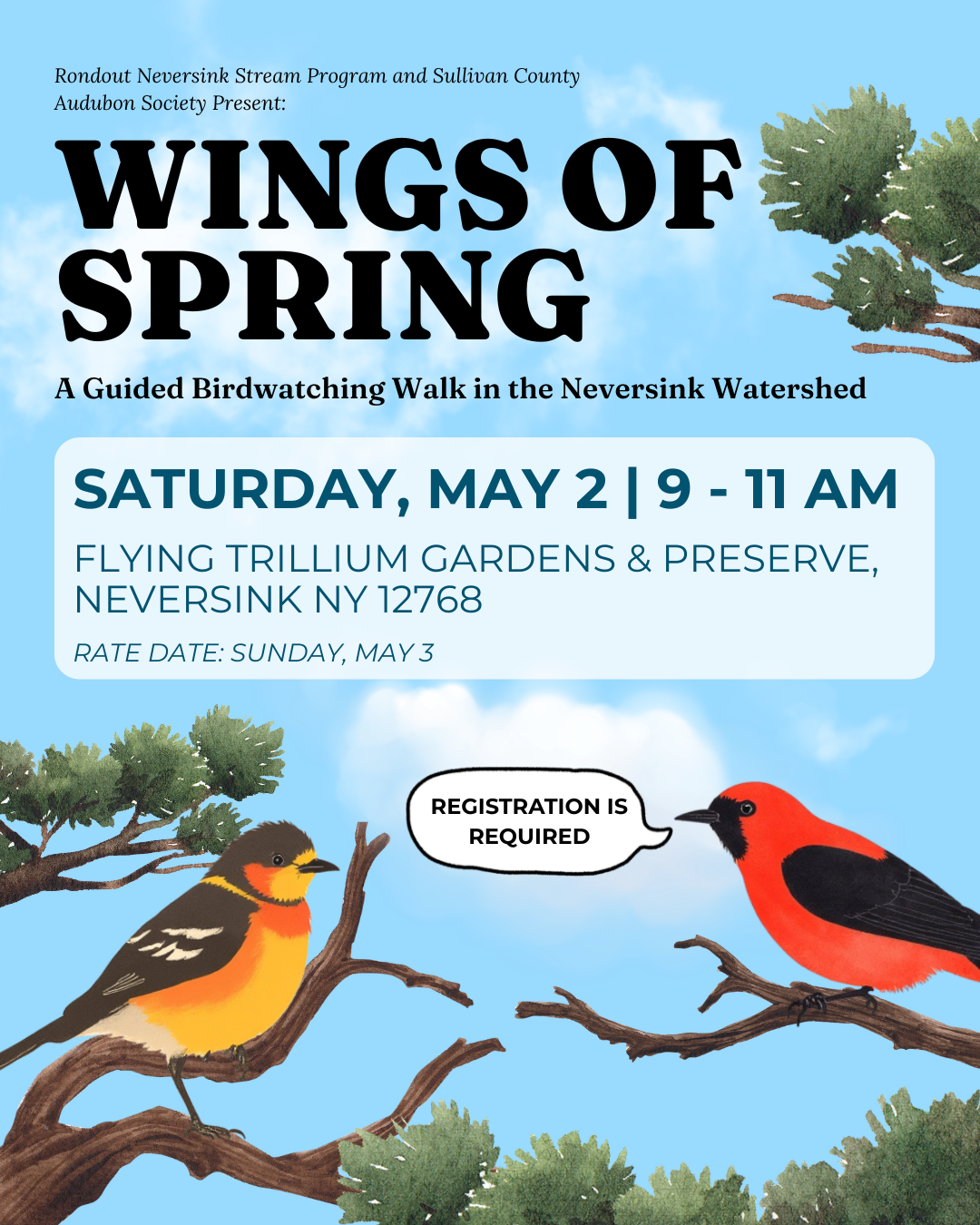 The walk will be led by Russ Scheirer, a local resident and experienced birder, SCAS Conservation Chair, and RNSP Nursery Technician. Join us for a relaxed morning outdoors at the Flying Trillium Gardens and Preserve in Neversink, NY, where we’ll look and listen for spring birds while exploring the sights and sounds of this beautiful site. Along the way, participants will learn tips for identifying birds by sight and sound and gain a deeper appreciation for the wildlife that call the Catskill watershed home. This event is beginner-friendly and open to all ages. Birders of all experience levels are welcome.